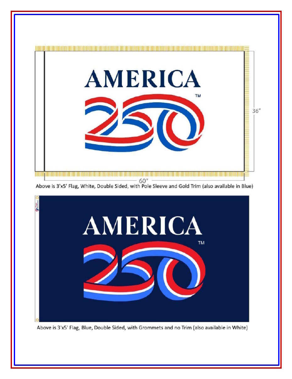 To simplify the purchase of America250 Flags, as well as take advantage of quantity pricing, we worked with Flags Unlimited to make custom double-sided flags (most America250 Flags are marketed as single-sided, meaning the ‘America 250’ on the opposite side of the flag is ‘backwards;’ double-sided correctly shows the design on both sides), beneficial pricing, easy ordering and processing, and a special on-line ordering link.