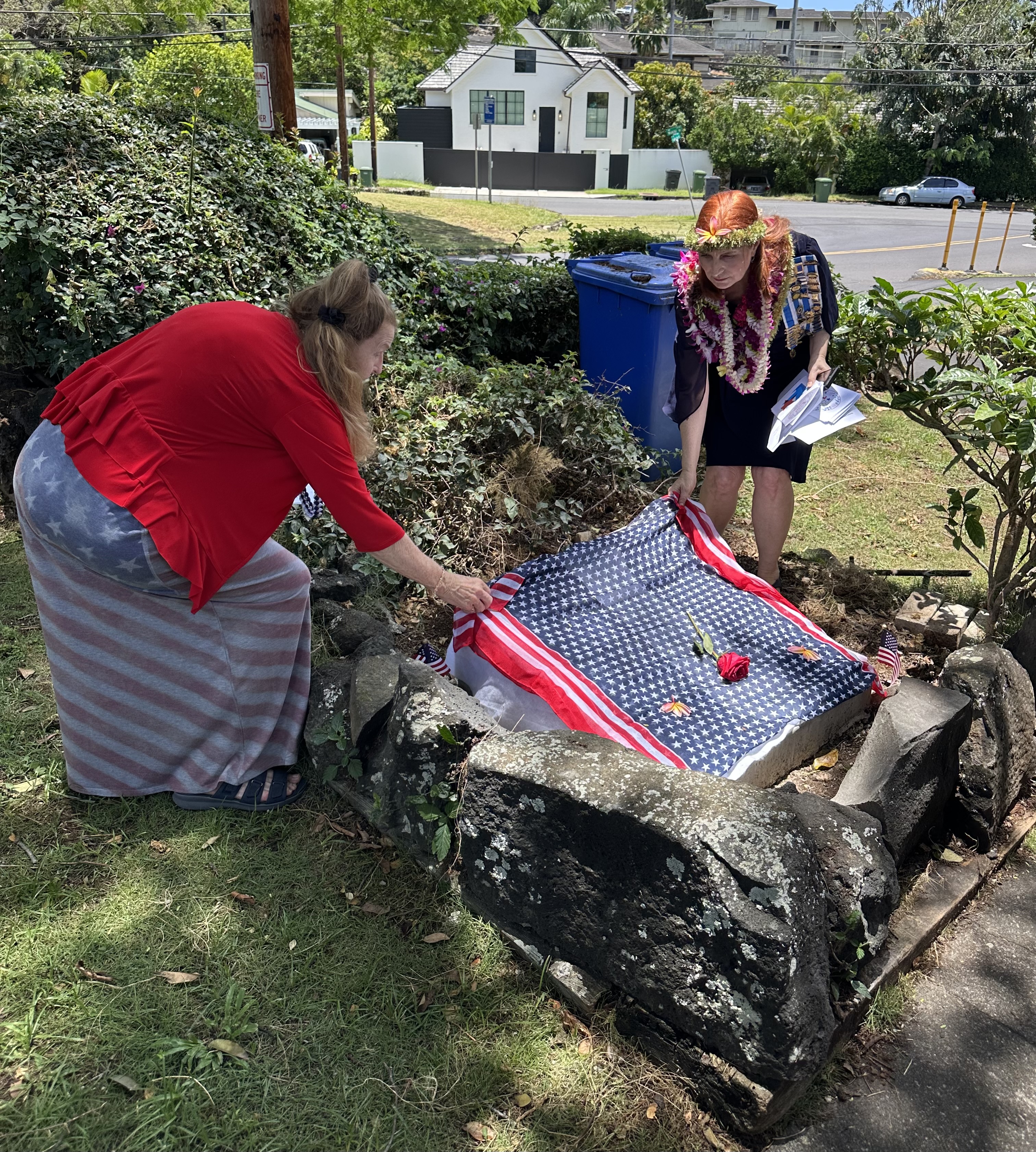 Julie Ignacio (center), Regent, and Laura Ingenlyuff, Vice Regent, Hawai'i State Organization NSDAR, were in attendance to help dedicate the Patriots Marker.