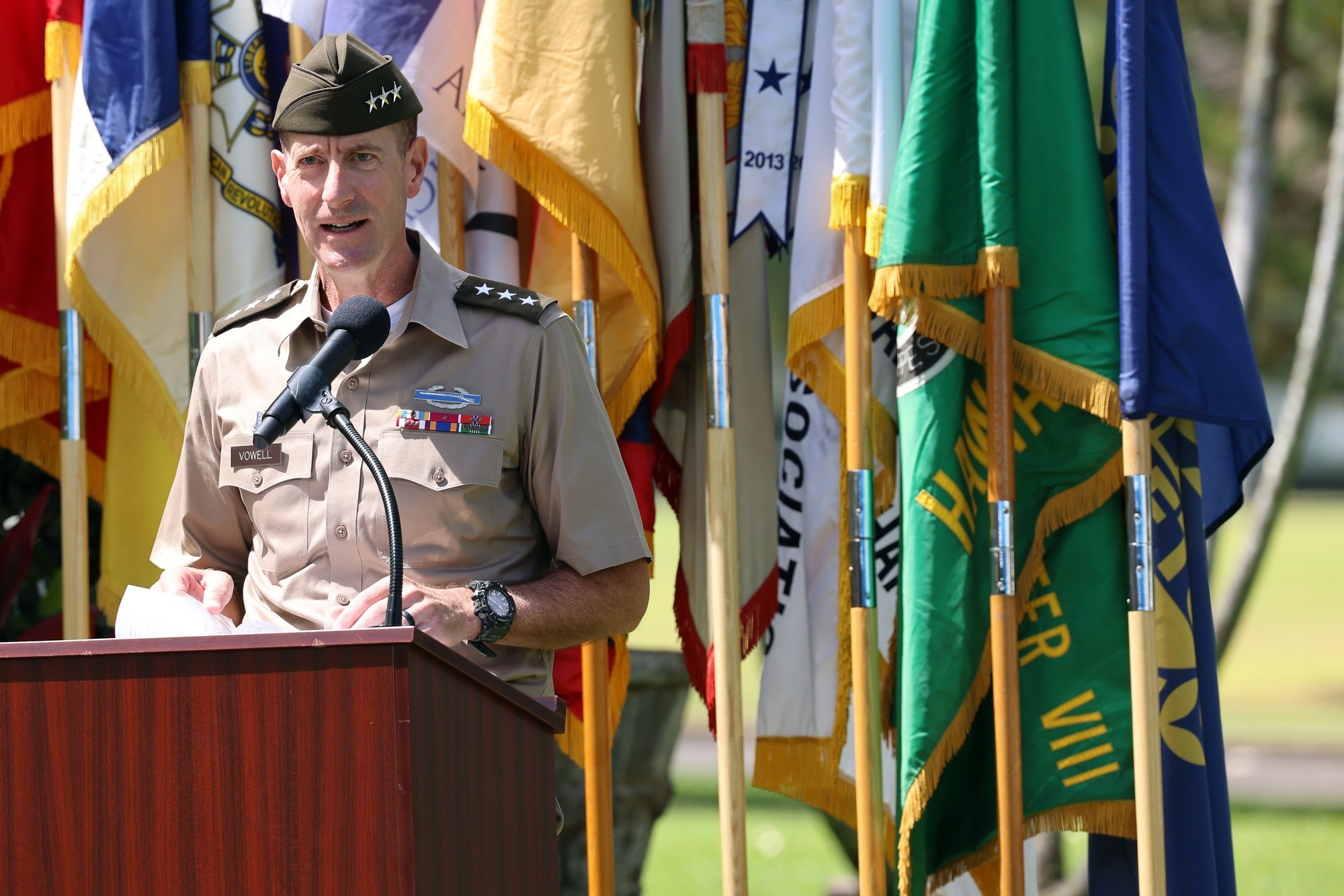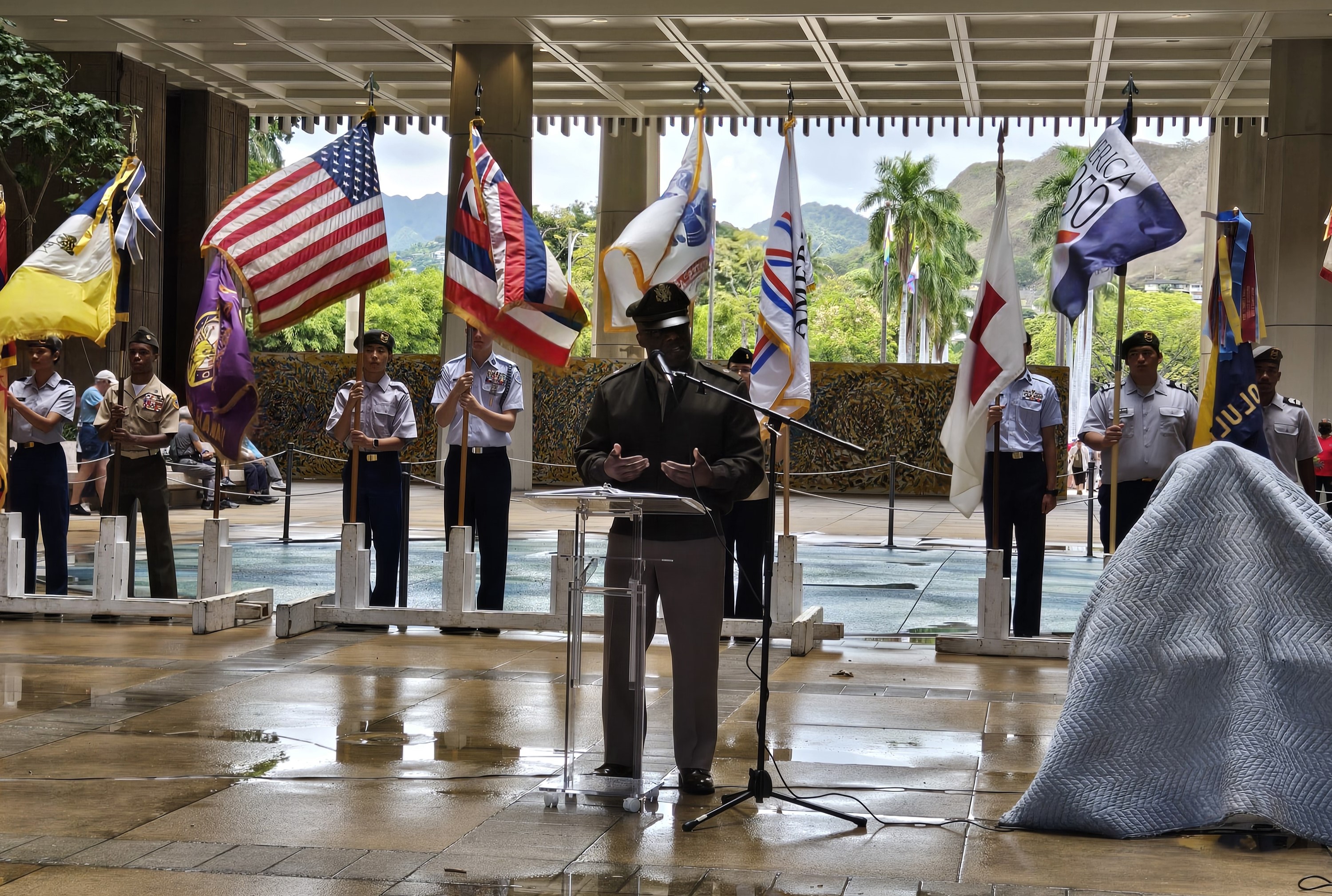 Lt. Gen. Joel B. Vowell, Deputy Commanding General for U.S. Army Pacific (USARPAC) delivers the keynote address at the Hawaii State opening ceremony for the Hawaii 250th Commemoration, on the 250th Anniversary of the first battle of the Revolutionary War at Lexington and Concord.
