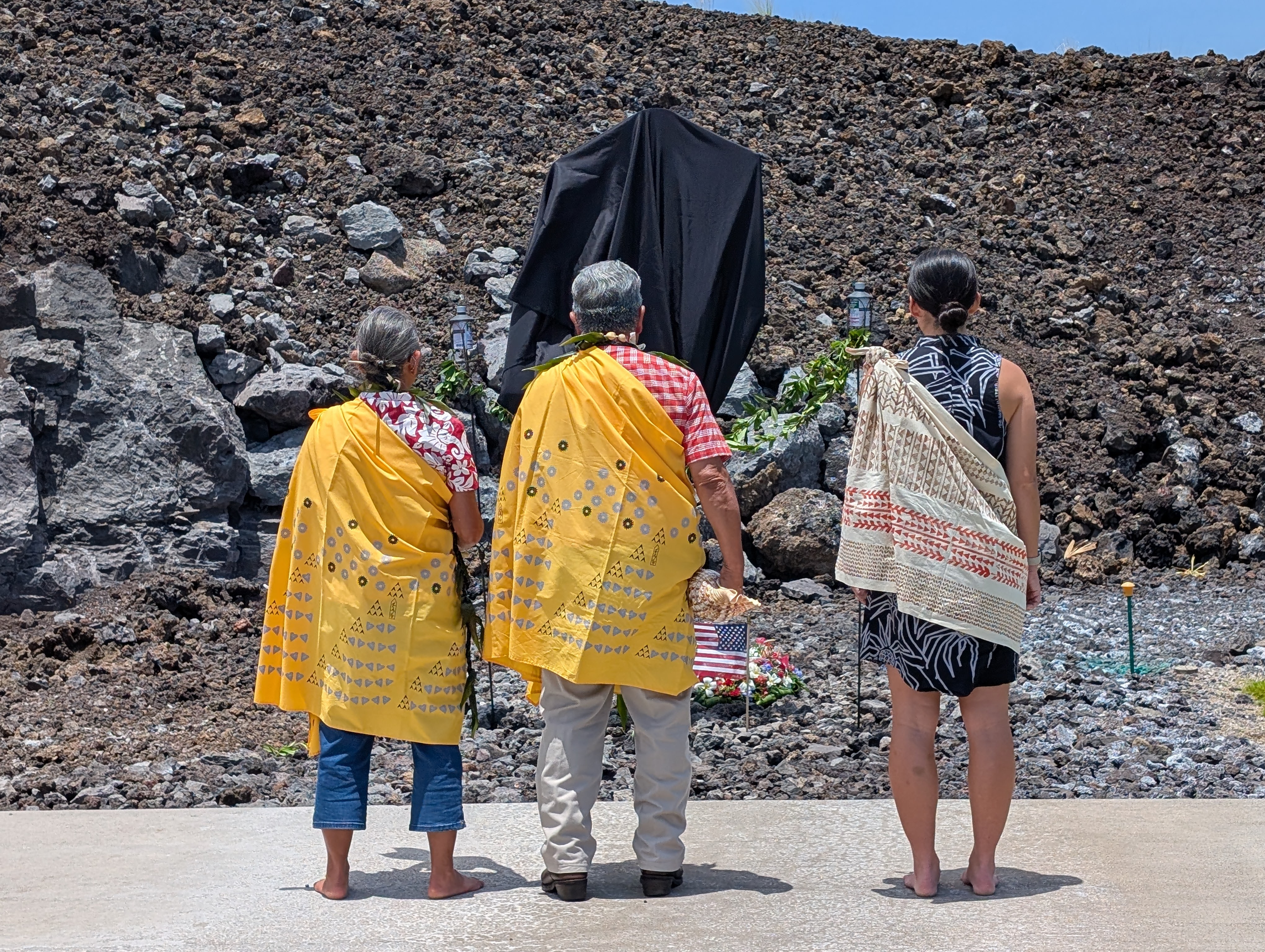 Danny and Anna Akaka, accompanied by Ke'alohi Wang, offered a traditional Hawaiian blessing before the unveiling of the Patriots Marker.