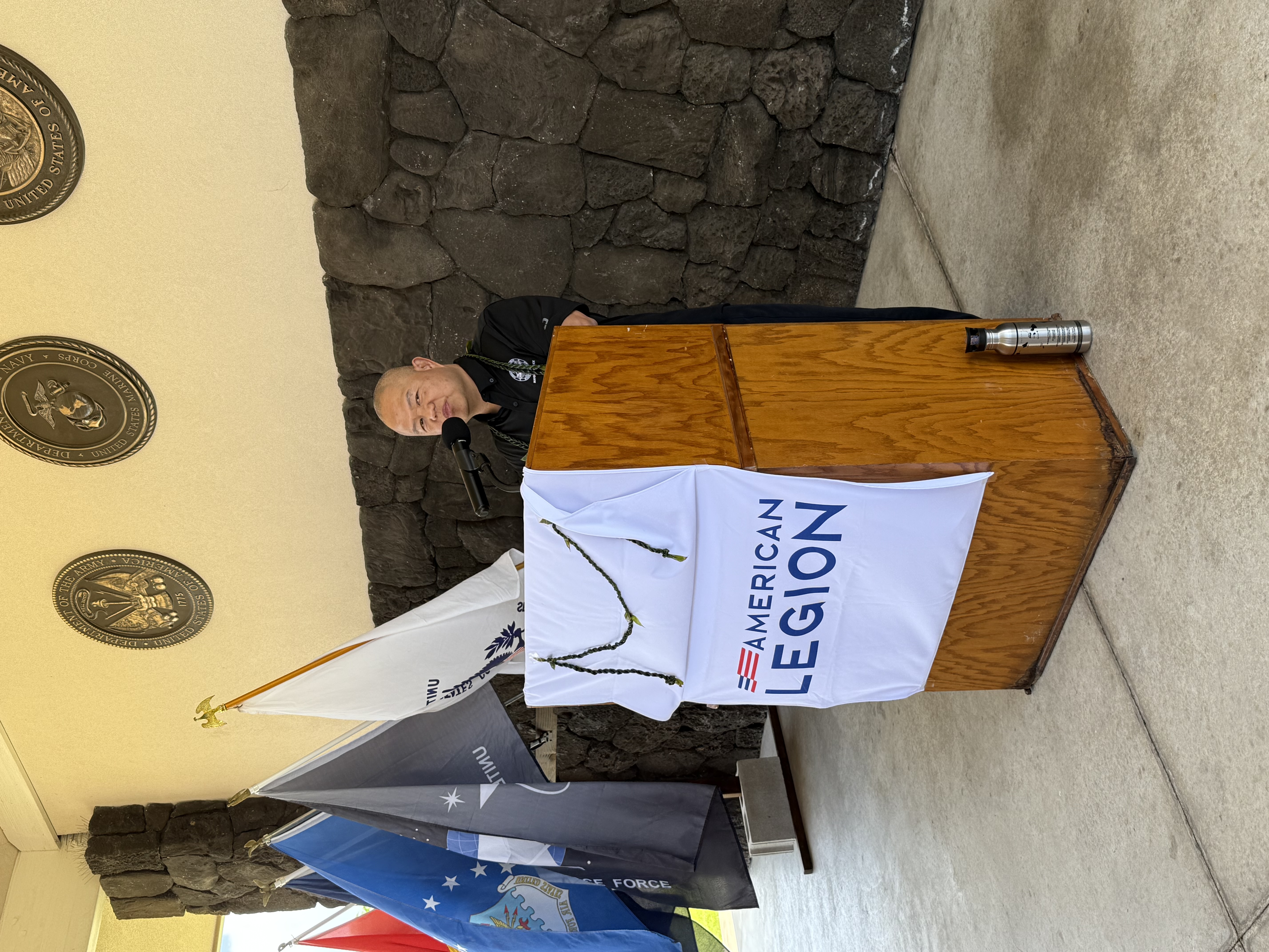 Ke'alohi Wang opens the ceremony with a traditional Hawaiian Oli. Bruce Banick, Commander, Post #4, was Master of Ceremonies.