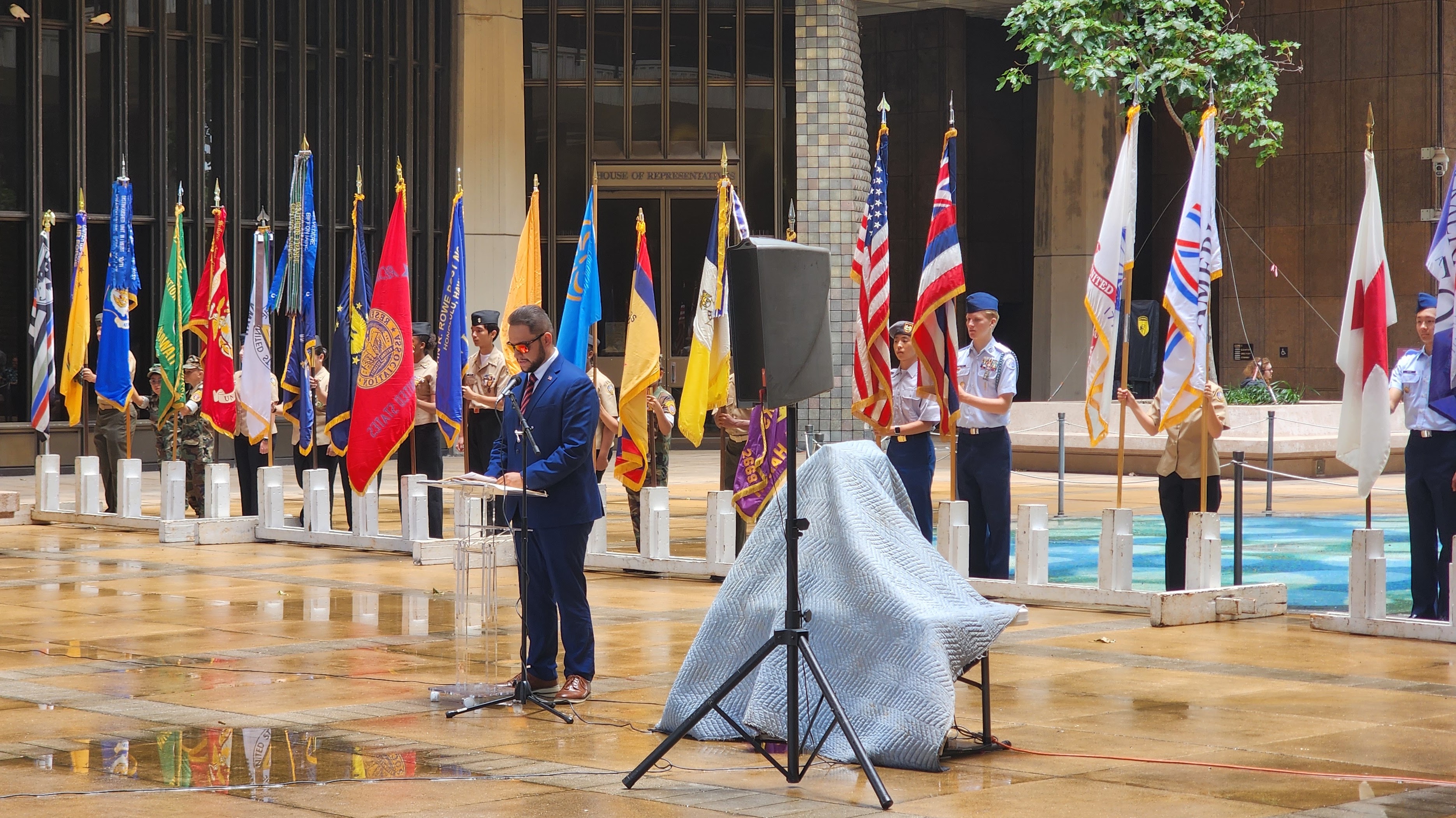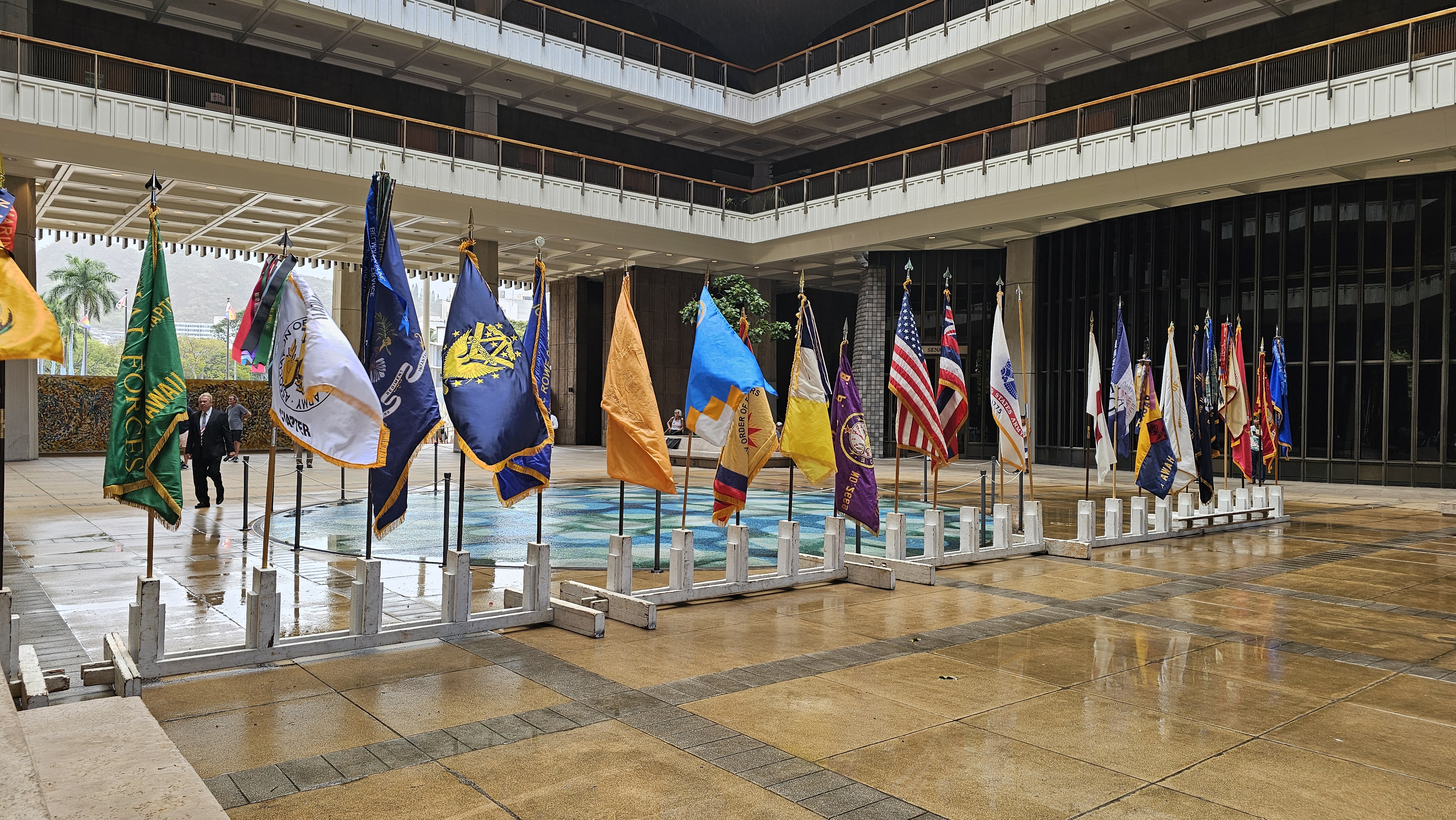 The event was held at the Hawai‘i State Capitol Rotunda to reflect the role of the legislative branch in adopting the flag.